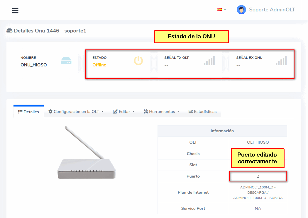En este momento si vemos el estado de la ONU, este se encuentra en Offline debido a que físicamente no sé ha cambiado la ONU de Puerto, pero en AdminOLT si se ha actualizado la información.