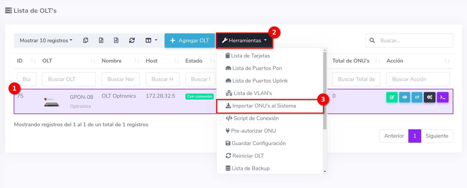 1En la Lista OLT's seleccionamos el equipo con el que trabajaremos para después ir a Importar ONU's al Sistema, que se encuentra en el botón con la leyenda Herramientas.