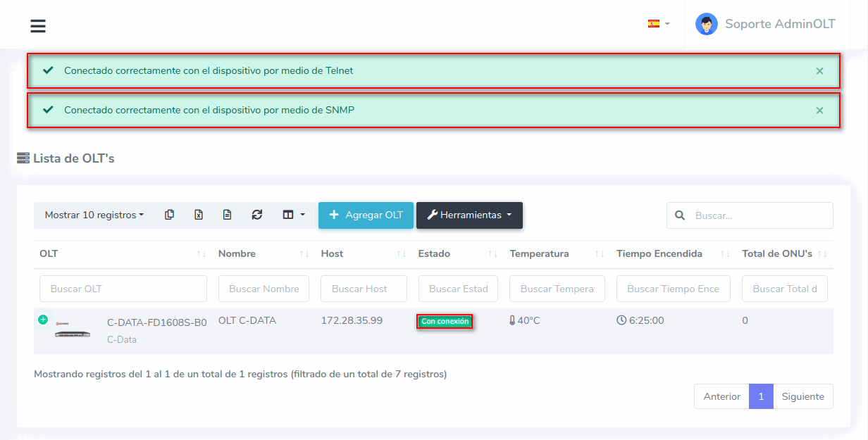 5 Verificar la conexión de su OLT en AdminOLT (en caso de que no haya conexión por SNMP es porque su OLT aún no cuenta con las configuraciones iniciales).