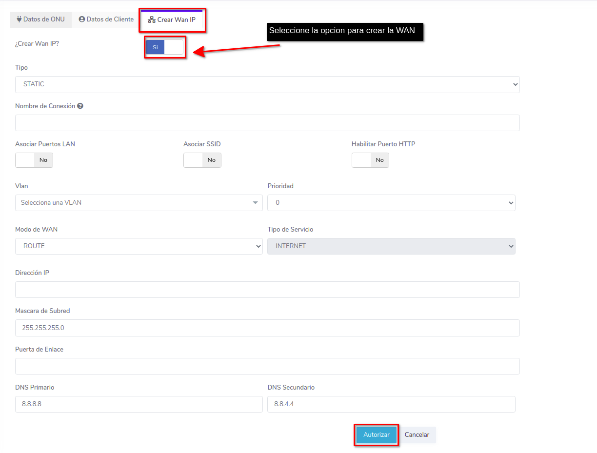 2Seleccione la opción Crear WAN IP y complete el formulario, con este proceso podrá autorizar y crear una WAN IP a una ONU al mismo tiempo.