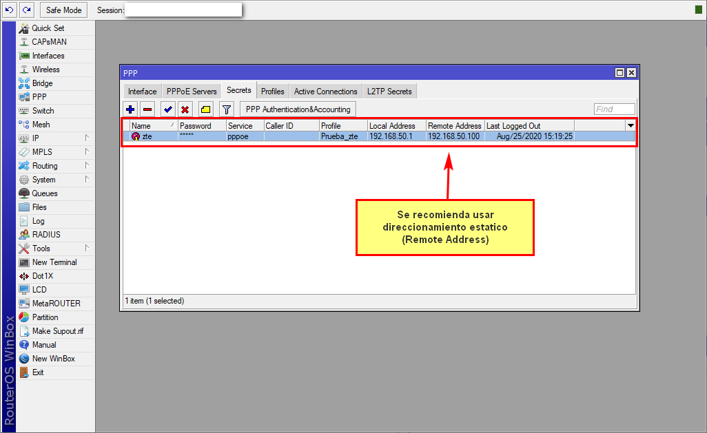 De igual forma se necesita ya tener el servidor PPP junto con su usuario. En este ejemplo usaremos un servidor en un dispositivo MikroTik.