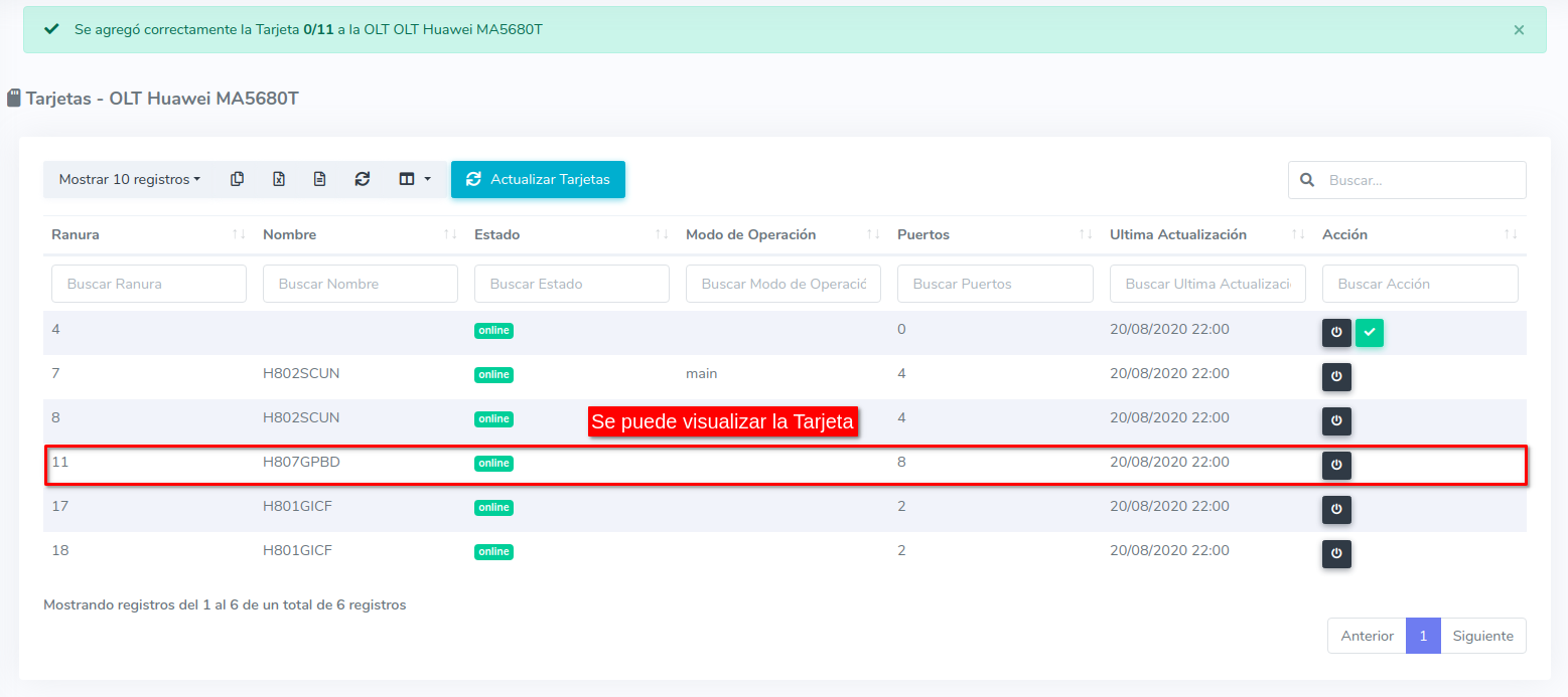 El sistema se conectará a la OLT y llevara a cabo el proceso. Una vez terminado será redirigido a la Lista de Tarjetas, donde podrá visualizar que la tarjeta ya tiene nombre.