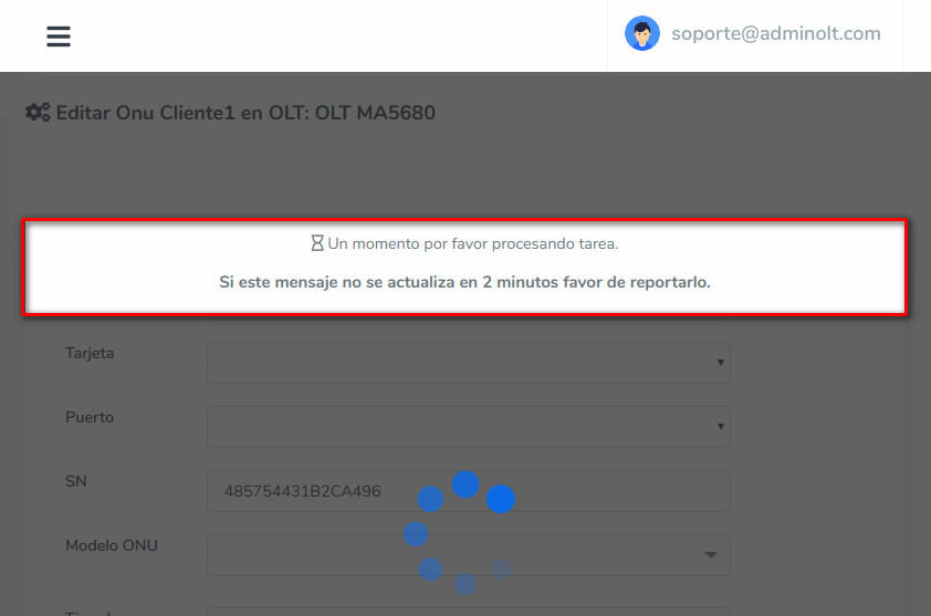 5 Esperamos que AdminOLT se conecte con su OLT y haga los cambios.