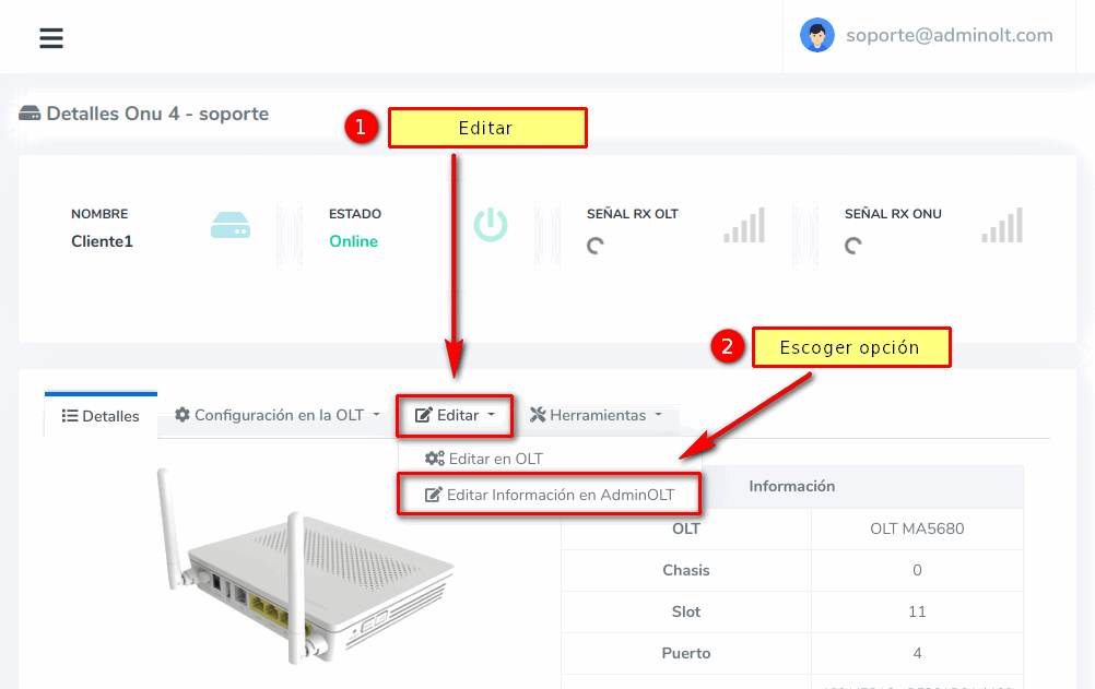 Editar ONU en AdminOLT desde Detalles de ONU