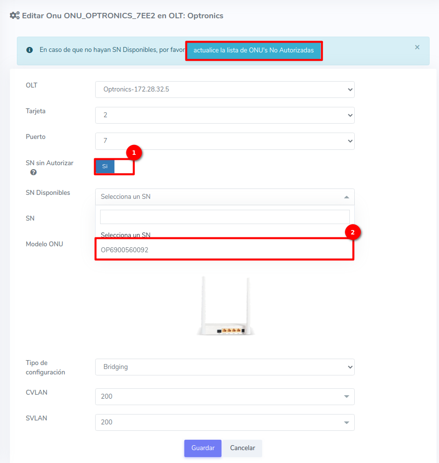 Editar ONU Optronics por Numero de Serie (SN)