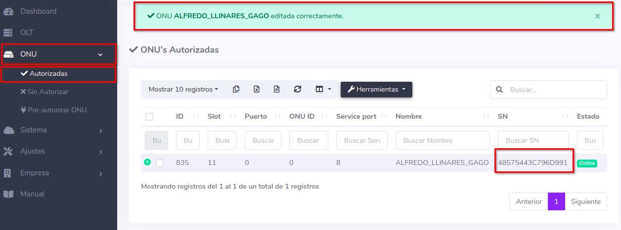 - Onu Autorizada en la OLT. Ver más detalles