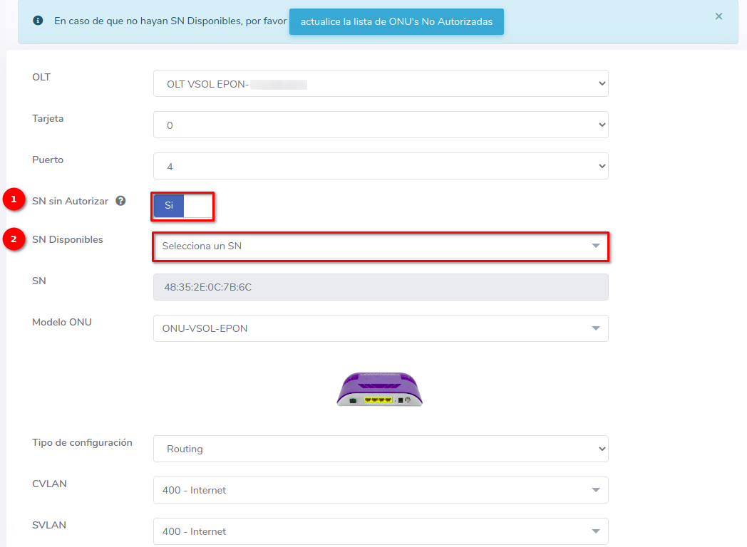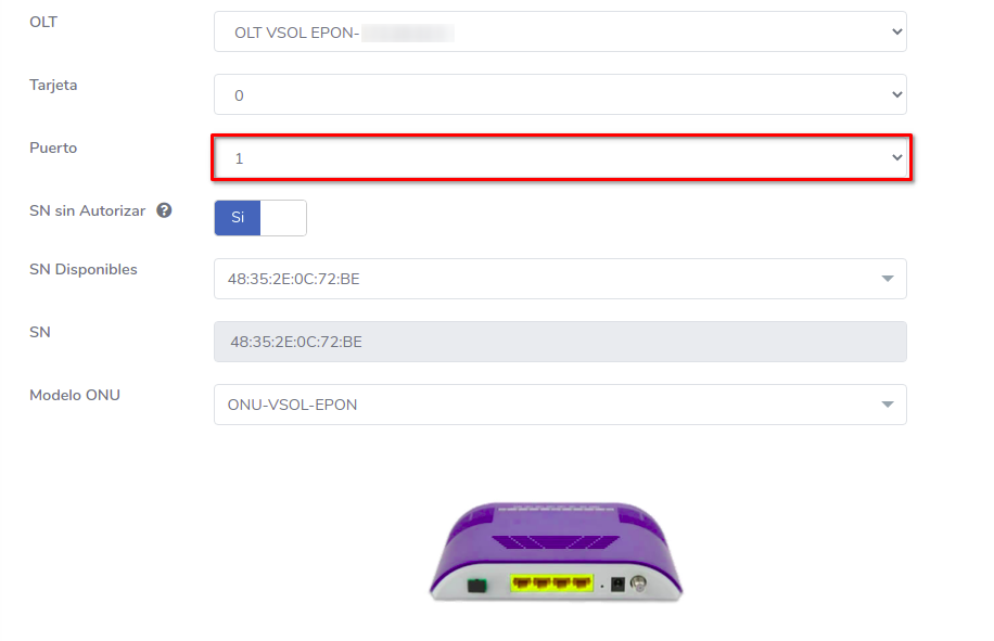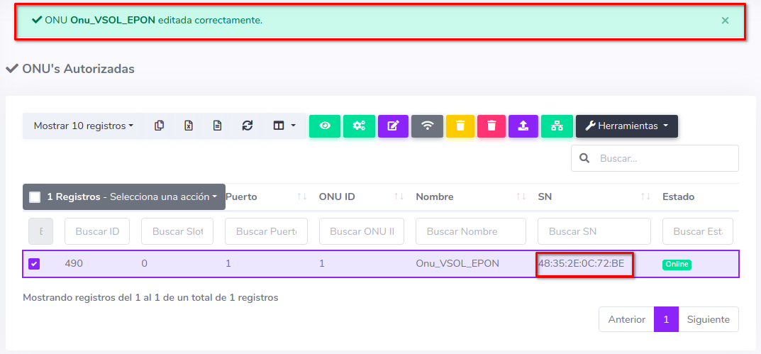 Editar ONU Vsol EPON por Numero de Serie (SN)
