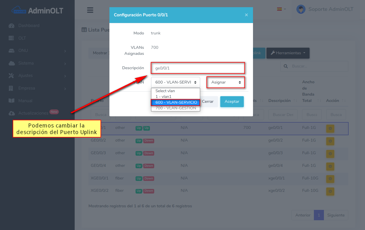 Puede escribir una descripción y escoger entre asignar o remover la VLAN