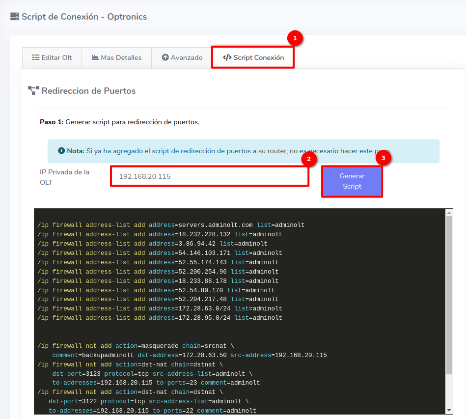 2 Nos dirigimos en la pestaña Script Conexión, aquí ingresaremos nuestra ip privada y seleccionamos la opción Generar Script. A continuación veremos que se nos proporciona un Script.