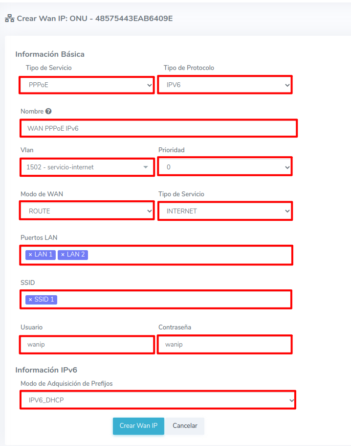 - Información IPv6: Cuando se tiene seleccionado IPv6 se puede configurar IPv6_DHCP o Prefix